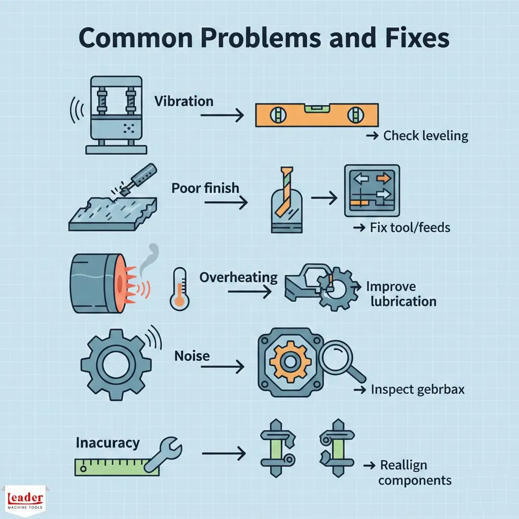 If any issue continues, avoid makeshift fixes. Use only trained technicians or reach out to Leaders Machine Tools Support.